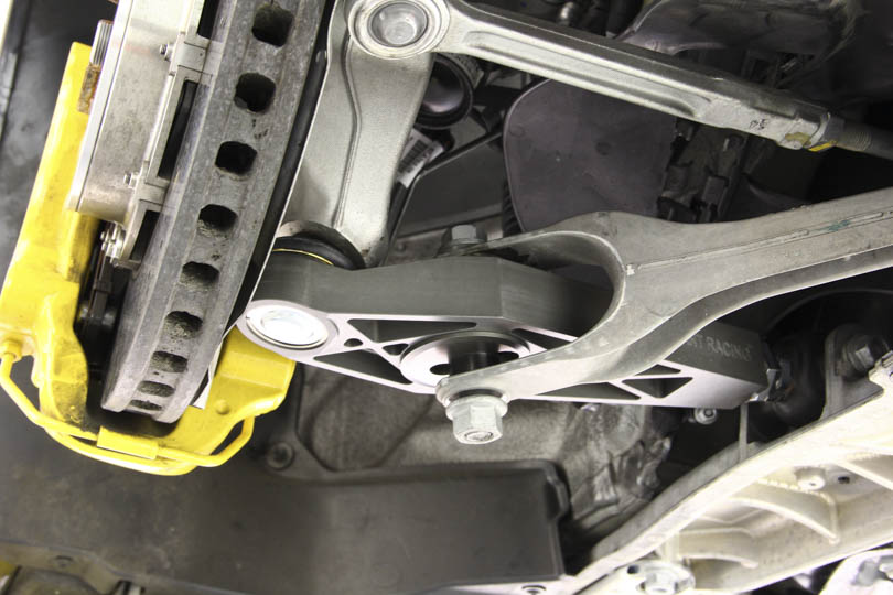 Once the bushing is pressed in, lower control arms can be reinstalled. On this car, we’re replacing the OEM arm with our adjustable control arm.
